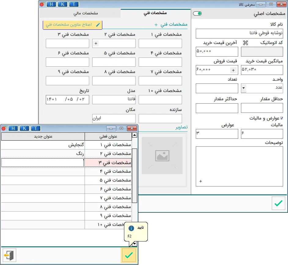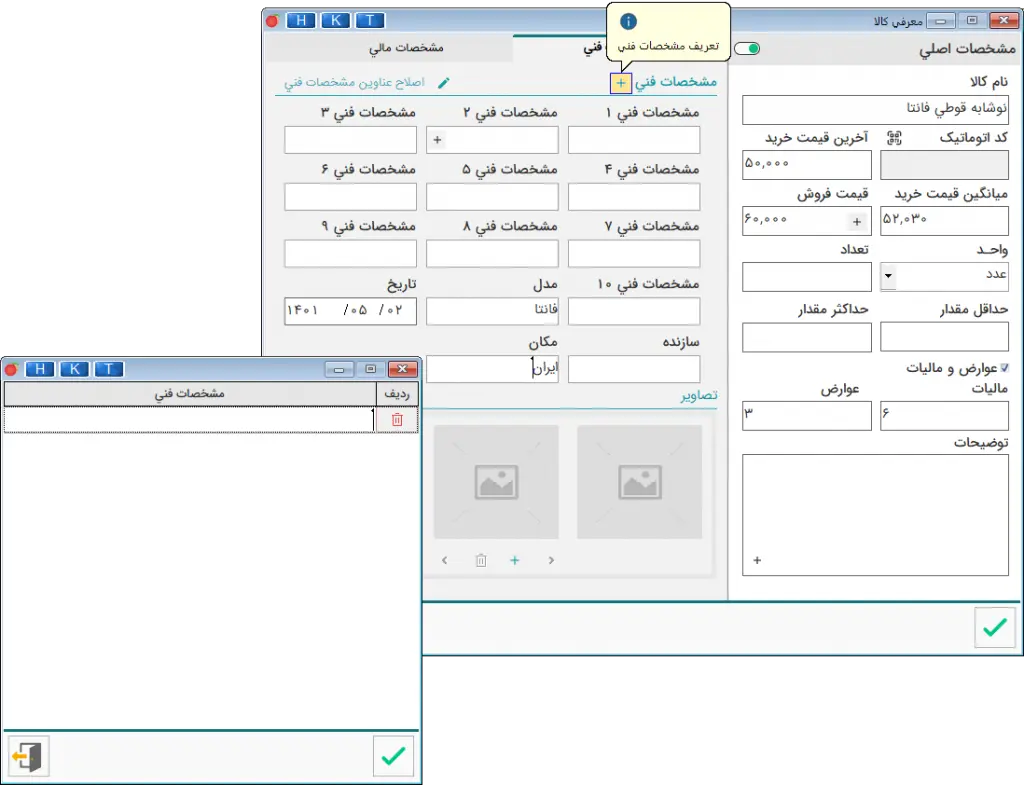 همچنین با زدن دکمه مشخصات فنی، میتوانید تعاریف آماده را ایجاد کنید تا بتوانید برای درج مشخصات فنی کالاهای دیگر نیز استفاده نمایید