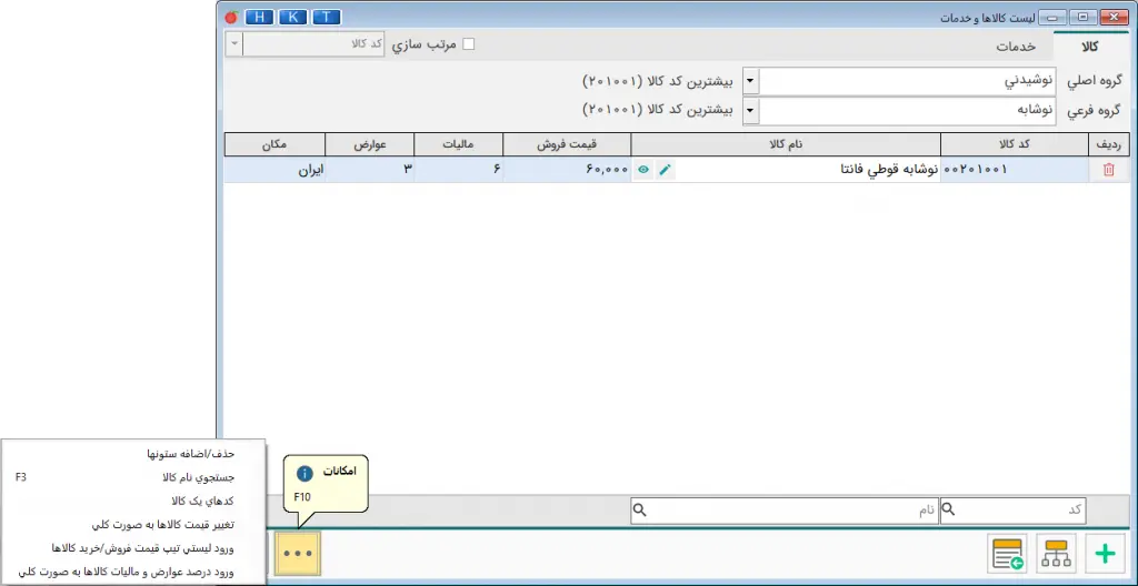 با زدن كليدF7 فرم جستجو به حالت عادي و بدون شرط خاص، گشوده شده و كالاها مشاهده ميگردند. با استفاده از كليد F9 ميتوان جستجو را براساس گروههای اصلی و فرعي تغيير داد. در فرم جديد تمام يا قسمتي از نام گروه فرعي را وارد نماييد، كليه كالاهاي زير مجموعه آن گروه فرعي مشاهده شده و با کليک روي گروه اصلي يا فرعي، آخرين كد كالاي وارد شده در گروه اصلي يا فرعي نمايش داده ميشود. از اين نوع جستجو در صدور فاكتور و گزارشگيري نيز بسيار استفاده ميگردد.